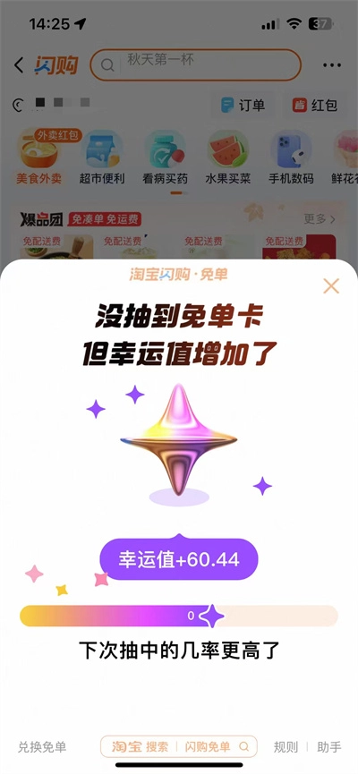2、没抽中免单卡也没关系,会增加幸运值,下次就能抽中啦