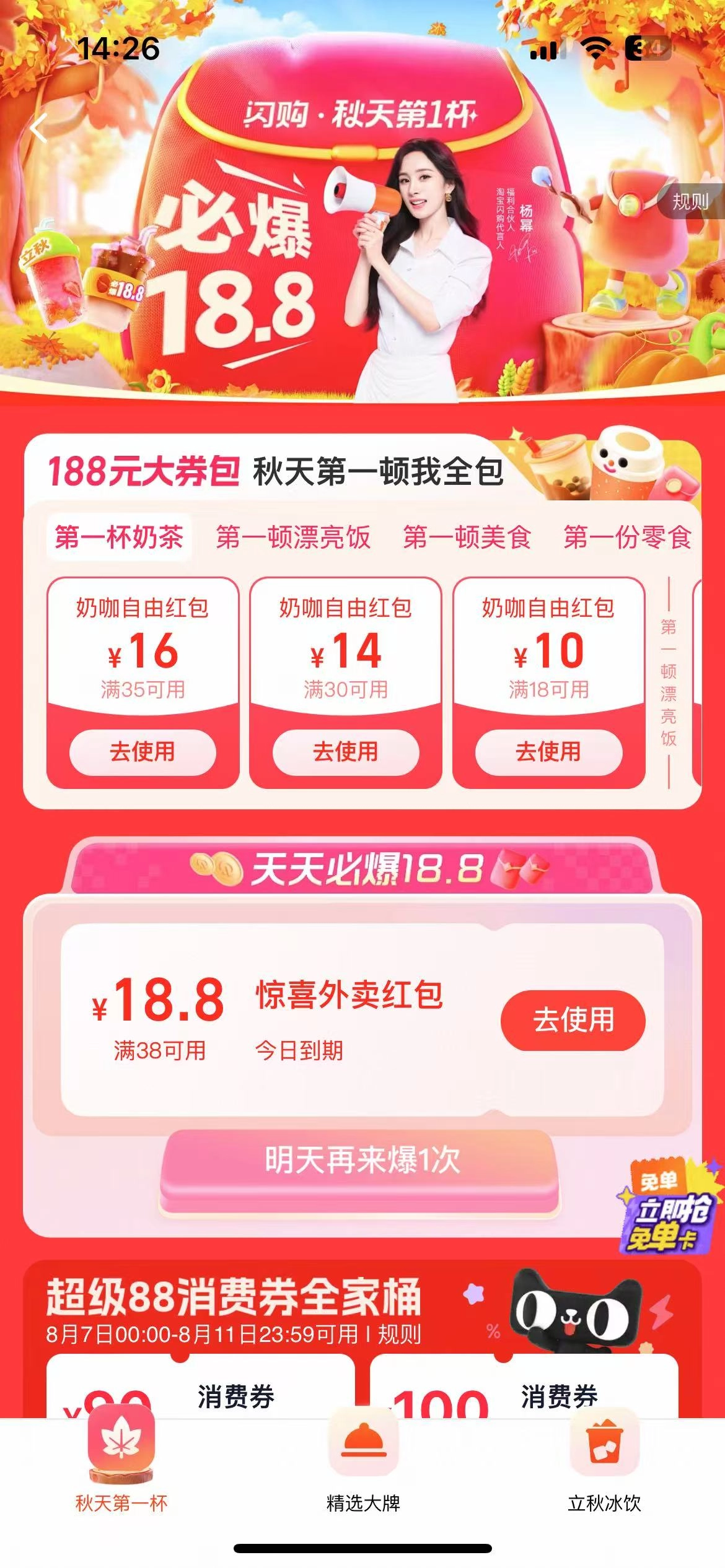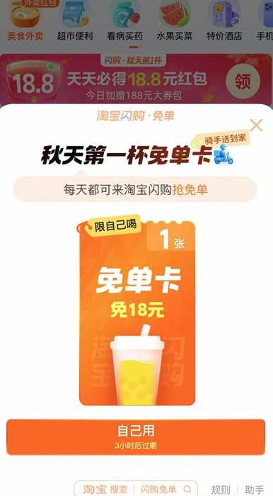 在淘宝闪购APP搜索秋天的第一杯奶茶即可免费领取188元大卷包