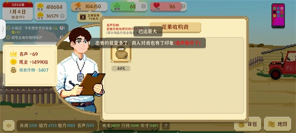 1.有了车之后,去哪都不再消耗体力,先去大农场租田,花20000块钱把拖拉机升级两次,开始种田,工作室也可以逐渐替换成优秀的三星人才,只接大单,把所有人才的工作能力都指导成6000左右;