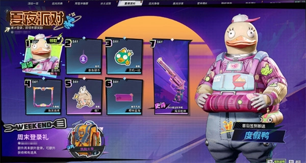 2、首日登录即送鸭鸭稀有皮肤【度假鸭】,满七日可得决斗者左轮史诗枪皮【海滨枪神】,周末登录还可限时获得史诗级背包【热狗大亨】夏日主题外观,即刻登录解锁清凉备战。