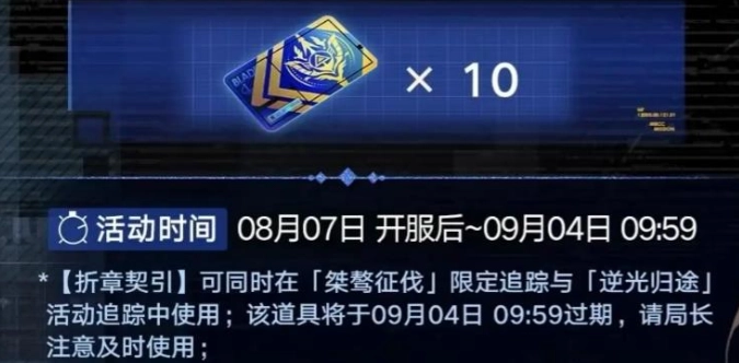 三周年庆典的序幕已经拉开,活动将于8月7日正式启动。登录游戏,你就能直接获得【折章契引】x10,这个道具可是非常重要的,它不仅能在“桀骜征伐”和“逆光归途”这两个活动中使用,还能帮助你在活动商店兑换丰富的奖励。