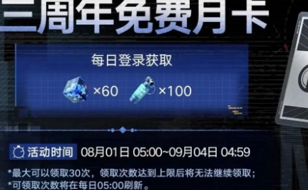 只要在活动期间累计登录7天,你就能领取到包括异方晶、留影胶片在内的丰富奖励。此外,还有一种福利方式,那就是三周年的免费月卡。每天登陆即可领取【异方晶】和【留影胶片】奖励,累计最多能领取30次,记得把握住每天的领取机会!
