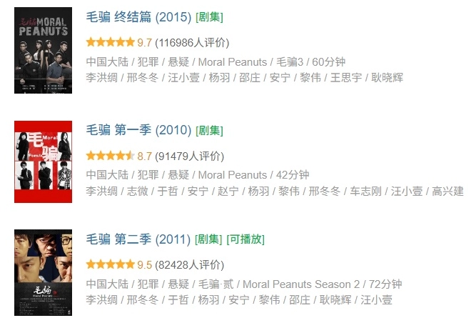 《毛骗》是优映文化制作的国产高分犯罪悬疑剧,共推出三季,其中第三季《毛骗 终结篇》豆瓣最高评分达到 9.7,豆瓣高分华语剧集榜第 18 名。