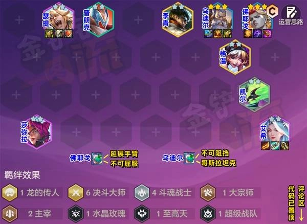 站位细节:前后排分开站就行,其中佛耶戈放第一排左或右上角(抓敌方后排C),乌迪尔和寒冰站同一侧,快速过前排。