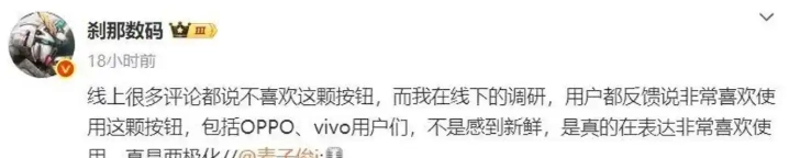 他还补充说,网上很多评论都说不喜欢这个按钮,但做了线下调研之后,用户反馈都非常喜欢用这个按钮,包括OPPO和vivo的用户,他们不是觉得新奇,而是真的非常喜欢用。
