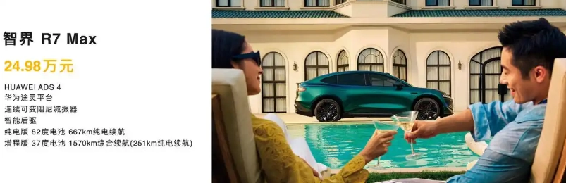 智界R7 Max 24. 98 万元版本,配备HUAWEI ADS 4、华为途灵平台、连续可变阻尼减振器、智能后驱;纯电版搭载 82 度电池,纯电续航667km,增程版配备 37 度电池,综合续航1570km(纯电续航251km)。