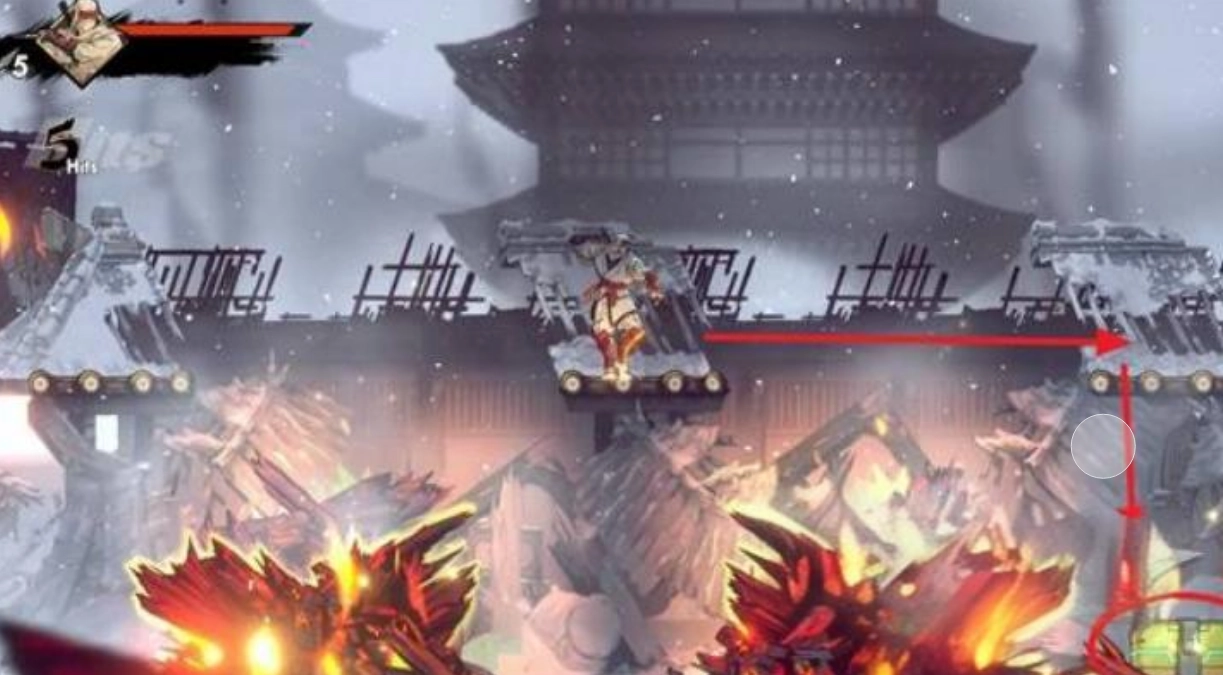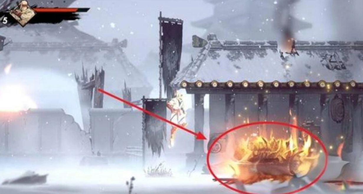 玩家需跳到下一个雪地区域,注意区域燃烧的火堆,主角只要碰到这种陷阱会立刻死亡,并消耗部分血量在旁边复活。
