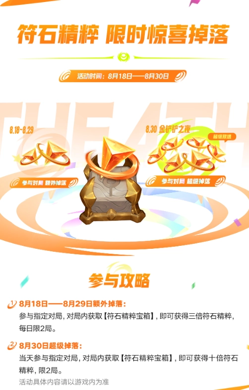 8月18日~8月29日额外掉落: 参与指定对局,对局内获取【符石精粹宝箱】,即可获得三倍符石精粹!(每日限2局)