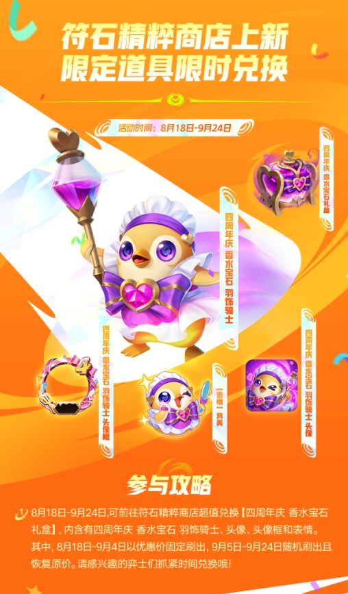 8月18日-9月24日,可前往符石精粹商店超值兑换【四周年庆香水宝石礼盒】,内含有四周年庆香水宝石羽饰骑士、头像、头像框和表情。