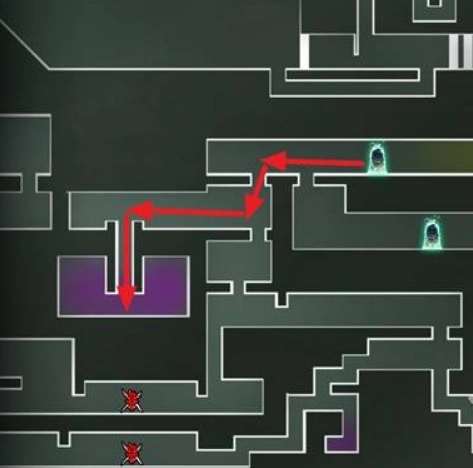 传送至石碑【西实验室】,沿红色箭头前往紫色房间。